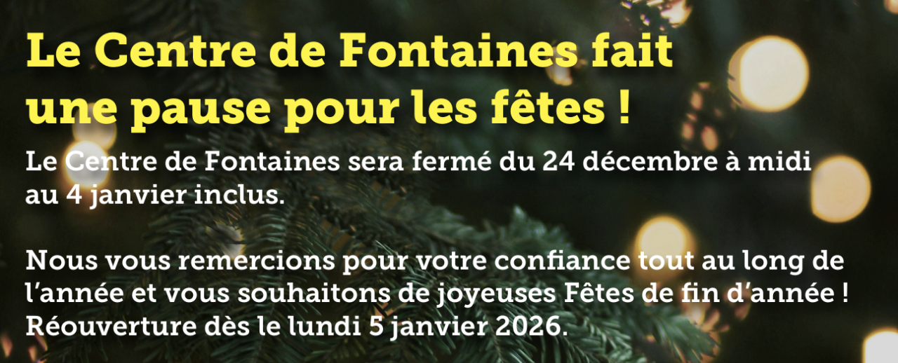 Horaires de fin d’année : fermé du 24 décembre 2025, midi au 4 janvier 2026. Réouverture le 5 janvier 2026.