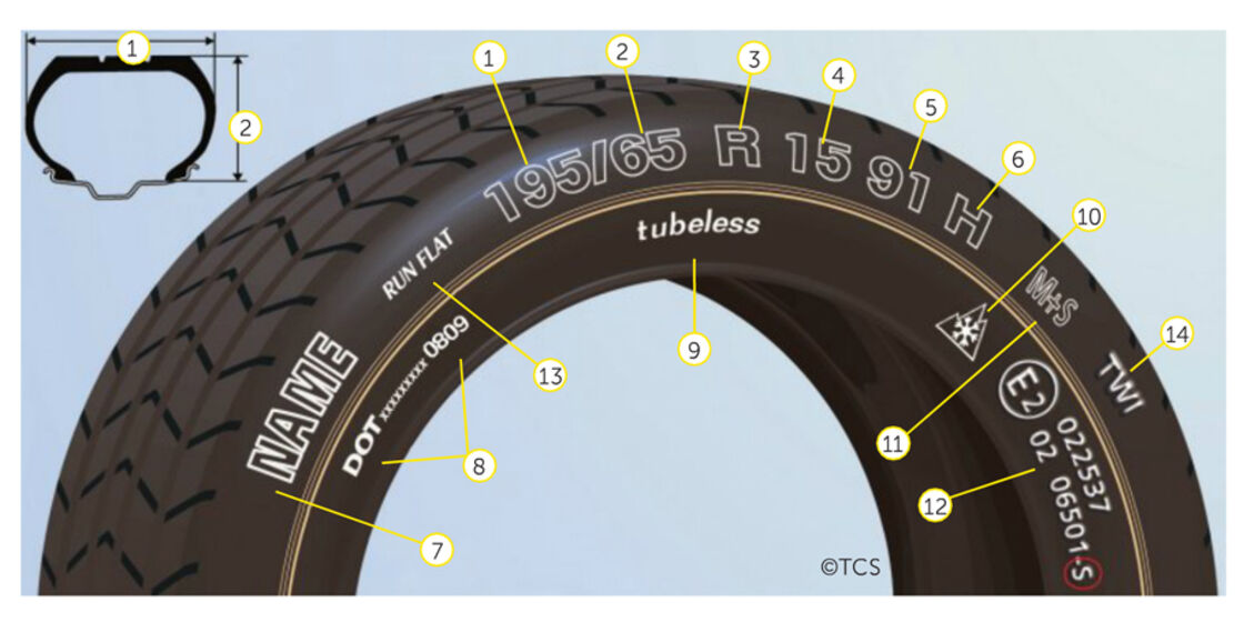 - DOT (Department of Transportation) : marque distinctive selon norme américaine. Les quatre derniers chiffres du numéro (TIN Tire Identification Number) indiquent l’année et la semaine de fabrication du pneu. Sur l’illustration, 0809 signifie : fabriqué la 8e semaine de 2009.